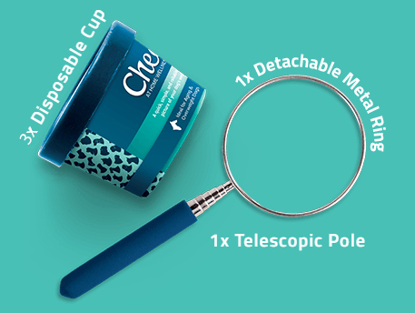 Each kit includes 1 pole (which can easily be assembled by screwing the ring into the telescopic pole), 3 disposable collection cups with lids and 3 pipettes and vials.