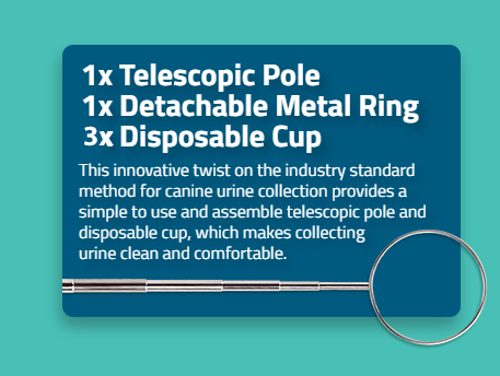 The P-Pole allows a dog owner to collect a urine sample while taking his or her dog on a regular walk. Each kit includes a pole (which can easily be assembled by screwing the ring into the telescopic pole), disposable collection cups with lids, pipettes and vials. Our twist on the industry standard – the “free catch” model – makes urine collection stress-free. Dog owners can then easily transport the sample to their veterinarian for further analysis. Conversely for monitoring a specific condition, the P-Pole can be used with our CheckUp diagnostic strips for at-home wellness testing.